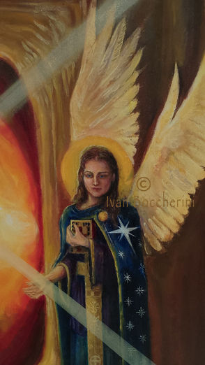 Oil paintings and mixed media artworks combining paint with metal and gems.